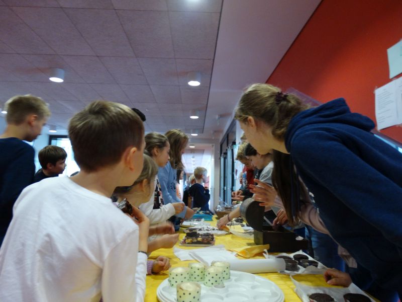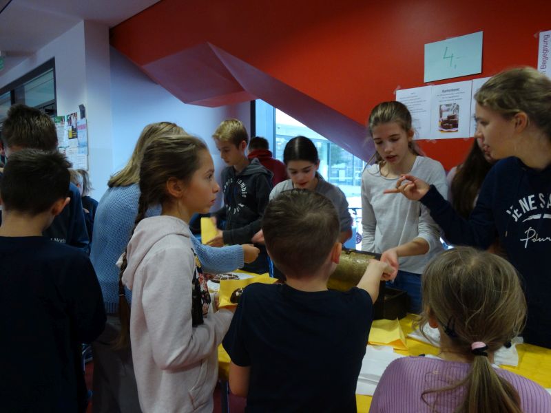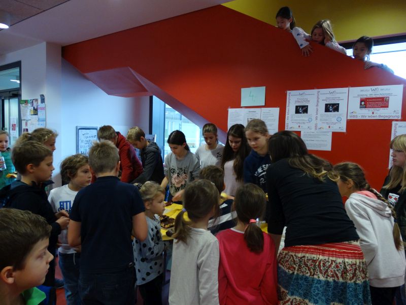 Uns (Krista, Aleksander, Klara und Clara) kam vor einigen Tagen die Idee, Geld für die Schulbibliothek zu sammeln, von dem wir neue Bücher kaufen könnten. Denn sicher kennt ihr das auch: ihr habt gerade das erste Buch einer spannenden Trilogie durchgelesen und stellt dann enttäuscht fest, dass es die weiteren Teile nicht in der Bibliothek gibt. Weil uns das auch passiert ist, schlugen wir vor eine Aktion durchzuführen, von der wir Geld zur Erweiterung der Bibliothek bekämen. Zusammen entwarfen wir Flyer, die wir noch am selben Tag in der gesamten Schule verteilten. Wir riefen lesebegeisterte Schülerinnen und Schüler auf, mit ihren Eltern Kuchen zu backen, welchen wir am 05.10. während der ersten beiden Pausen in der Eingangshalle verkauften. Die Aktion war ein voller Erfolg. Dieser ermöglicht der Schulbibliothek neue Bücher anzuschaffen. Büchervorschläge könnt ihr bei unserer Bibliothekarin, Frau Koszykowska, äußern.