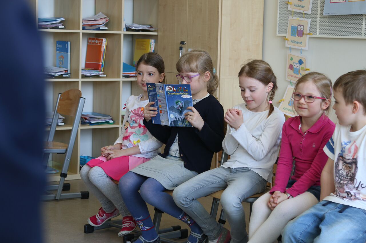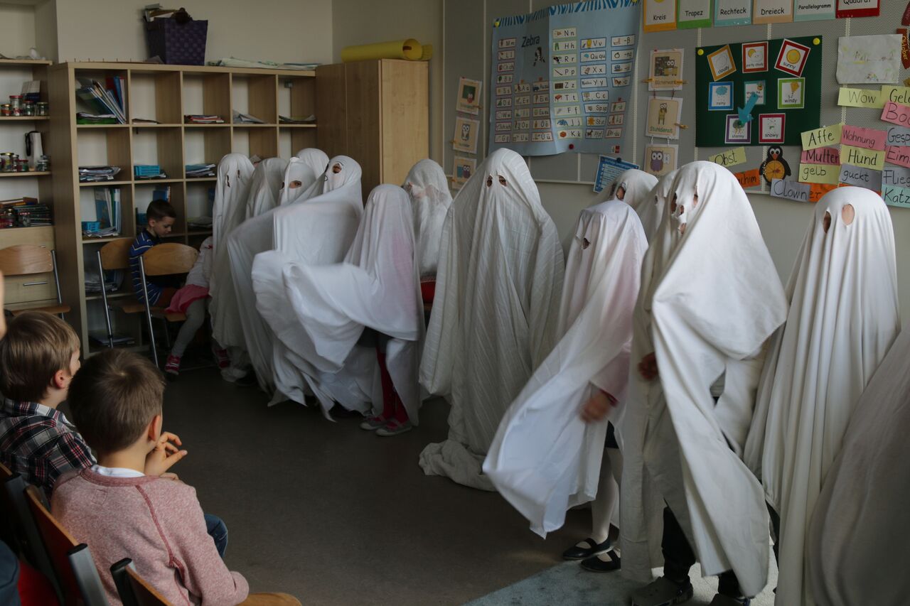Vergangene Woche fand in der Klasse 1a das bisher größte Spektakel statt. Die Kinder warfen sich in Schale – bzw. in ein weißes Gewand – und präsentierten ihren Eltern das selbst entworfene Theaterstück „Wer glaubt schon an Gespenster“. Die Aufregung war groß. Schon einige Tage zuvor übten alle ganz eifrig ihre Texte, ihre Stimme und Position auf der kleinen Klassenbühne und mit den Eltern zuhause. Die Aufführung wurde ein großer Erfolg. Im Anschluss konnte der eigentliche Teil des Festes losgehen – das Lesen. Jedes Kind las seinen Teil einer Gruselgeschichte nahezu fehlerfrei, betont und laut vor. Anschließend las jedes Kind einem Erwachsenen etwa 15 Minuten laut vor. Dazu suchte sich jeder Schüler seinen Lieblingsplatz im Schulgebäude. Die vielen individuellen Stimmen im ganzen Schulhaus brachten eine außergewöhnliche, ja fast schon magische, Stimmung hervor. Das Lesefest, als fester Bestandteil des WBS-Konzeptes, ist einzigartig. Sein Erfolg bewährt sich jedes Jahr aufs Neue und begeistert sowohl Kinder, als auch Eltern und Lehrer. Dabei ist der Lesepass, der jedem Kind anschließend überreicht wird, eine tolle und eine der einfachsten Methoden, Leselerner zum Lesen zu motivieren.