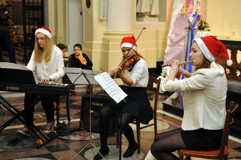 Das Konzert wurde mit einem Auftritt der 6. Klasse eröffnet, die das alte Lied Alle Jahre wieder auf Blockflöten spielten. Nach der Begrüßung von Herrn Frobieter kam eine Vielfalt von Darbietungen: Zuerst der Grundschulchor mit einer kleinen Auswahl deutscher und polnischer Lieder, danach das Geigenduett Theresa Jarczyk / Niccolò Sala, die Xylofonistin Dimana Nullmeier und der Pianist Jan Petersen.