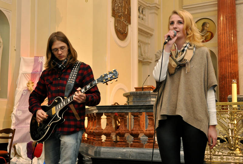 Nach diesen instrumentalen Stücken führte der Mittel- und Oberstufenchor drei Lieder a cappella auf und es folgten weitere Solisten: Rockduett Julia Kulikowska / Adam Malicki; Flötenduett Natalia Lemiszewska / Linda Wesche und Gesangsduett Theresa Jarczyk / Vera Wesche mit Klavierbegleitung von Anna Gaś.